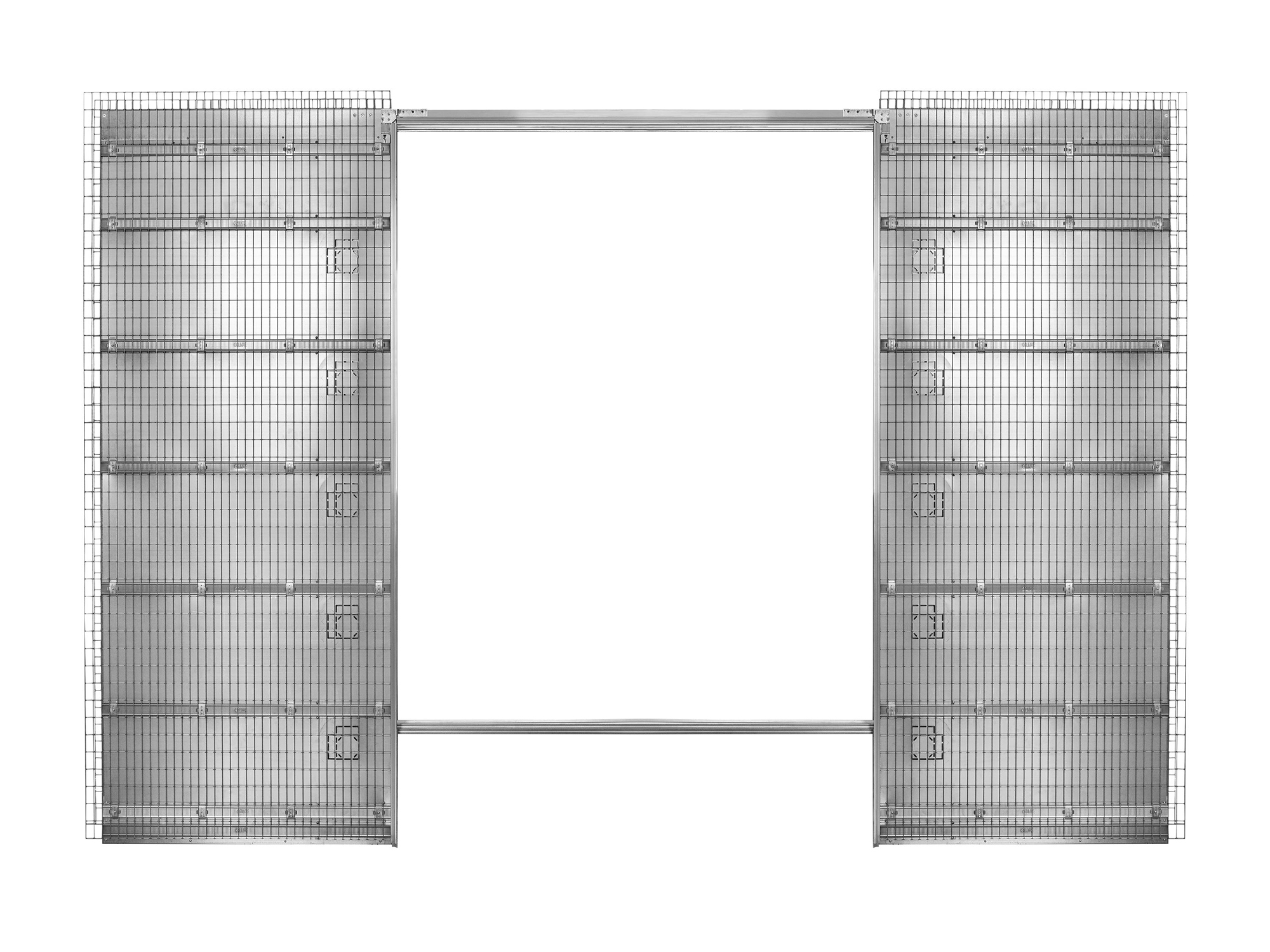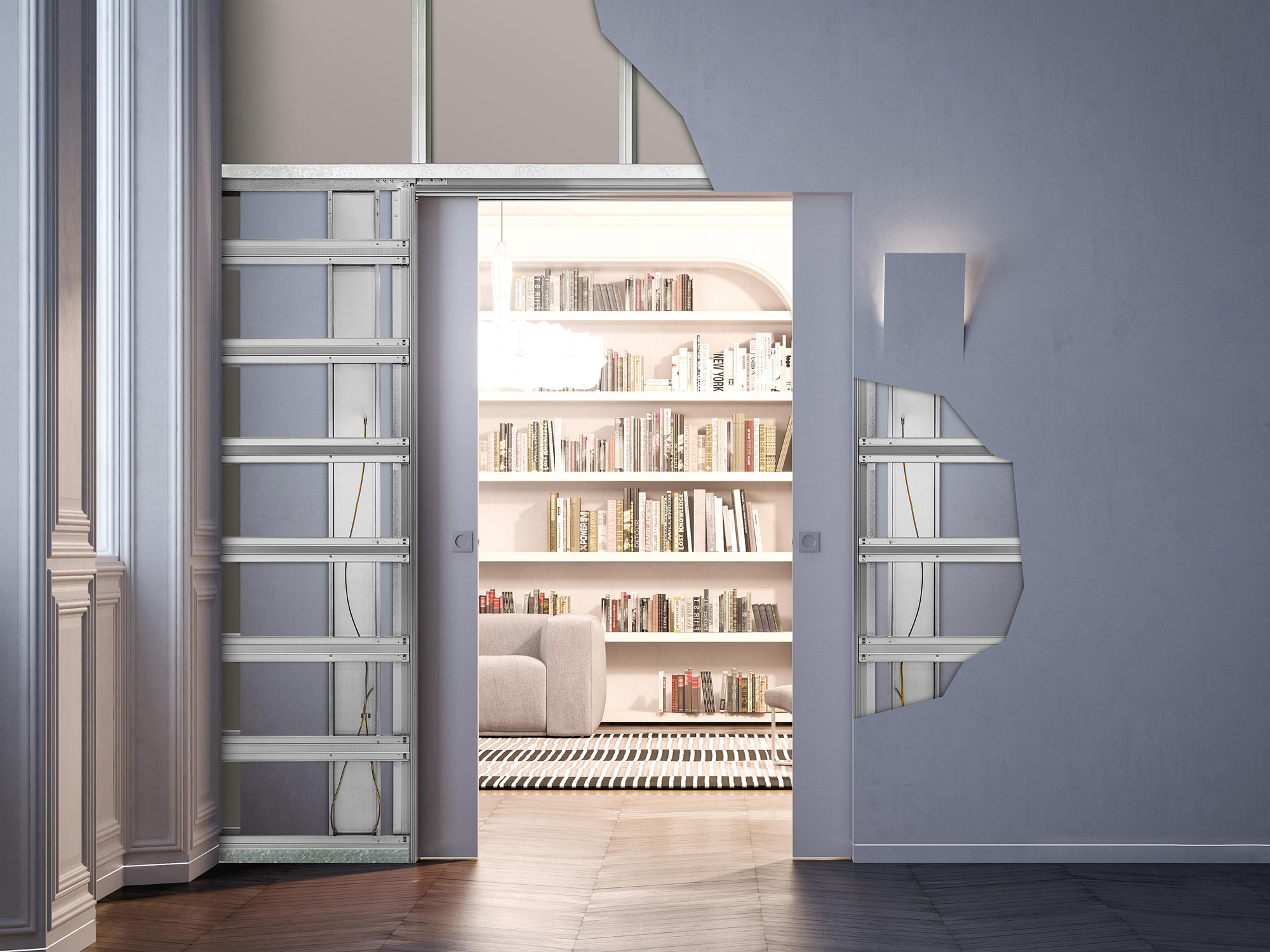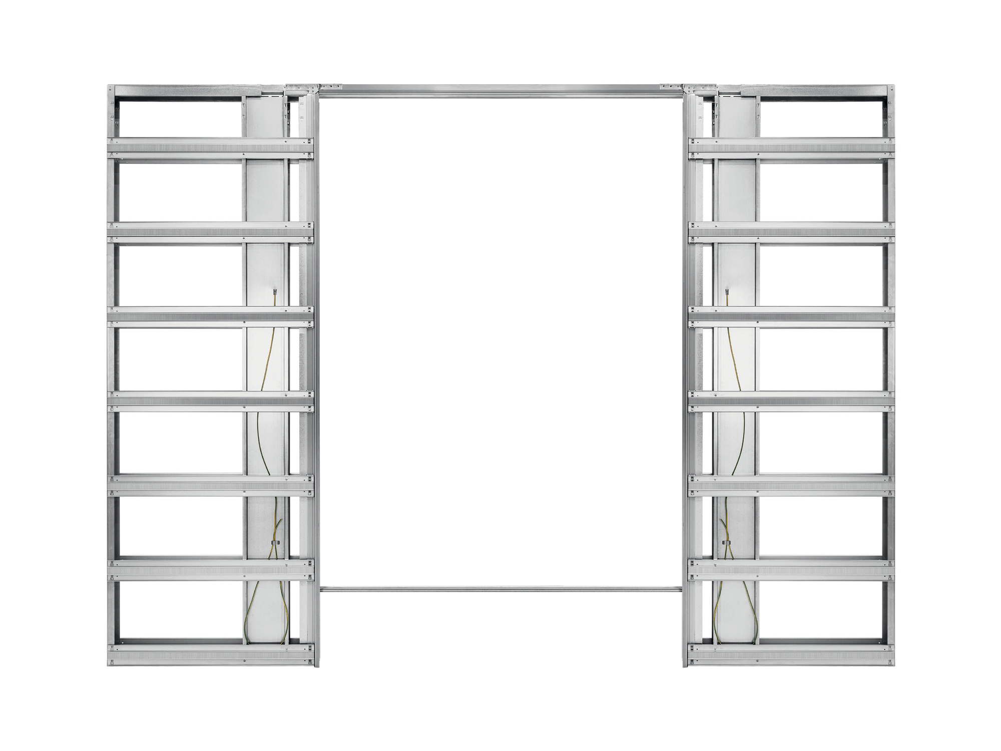 Controtelaio per due porte a scomparsa speculari filomuro, senza stipiti, predisposto per il passaggio di cablaggi elettrici