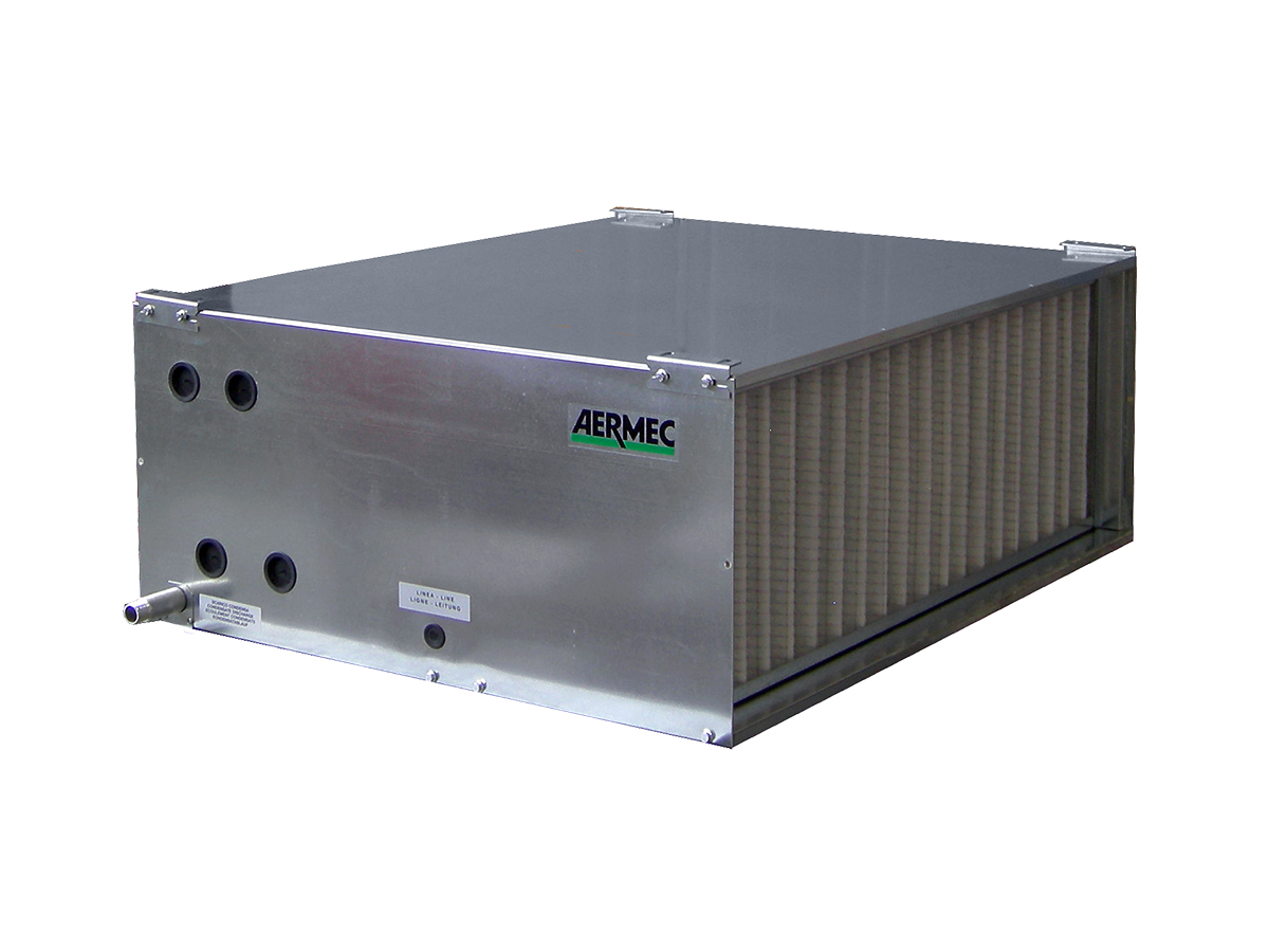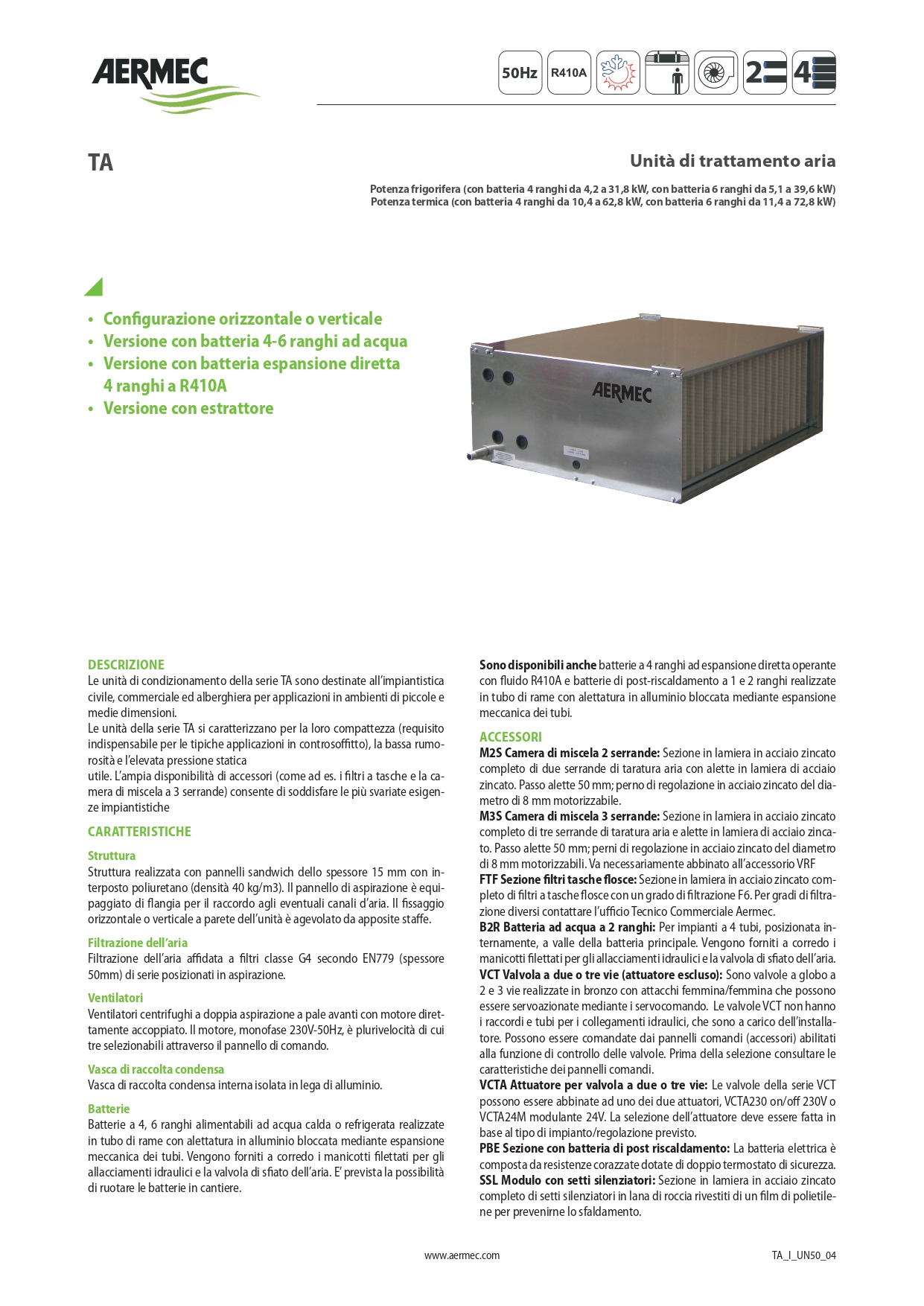 La TA è un’unità termoventilante progettata per garantire elevate prevalenze, compatta per installazione orizzontale o verticale in ambienti di piccole o medie dimensioni. Esistono due versioni dotate rispettivamente di batteria rame-alluminio a 4-6 ranghi ad acqua calda o refrigerata, oppure di batteria rame alluminio a 4 ranghi ad espansione diretta con R410a. La macchina è dotata di ventilatori centrifughi ad elevata prevalenza, doppia aspirazione, pale in avanti e motore elettrico direttamente accoppiato a più velocità di cui tre selezionabili. Inoltre l’unità possiede vasca di raccolta condensa interna e isolata in lega di alluminio sia per configurazione orizzontale che verticale. Ampia scelta di comandi a distanza e di accessori per soddisfare le diverse esigenze come batteria di post-riscaldamento a 1 e 2 ranghi, filtro d’aria G4, griglia di aspirazione e mandata, camera di miscela, flange di mandata con bocche circolari.