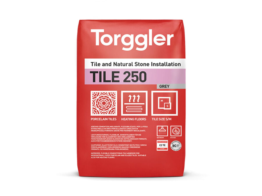 Tile 250 è un adesivo cementizio in polvere disponibile nei colori bianco e grigio, a base di cementi ad alta resistenza, inerti selezionati, resine sintetiche ed additivi specifici. Una volta mescolato con acqua si ottiene una colla di ottima lavorabilità , eccellente tixotropia, media flessibilità ed elevata adesività su tutti i tipi di sottofondo cementizio. Applicato in verticale non cola e non lascia scivolare le piastrelle. Il tempo aperto prolungato permette la posa sicura anche in climi caldi e ventilati. È resistente ai cicli di gelo e disgelo. Tile 250 è classificato come adesivo cementizio di classe C2 TE secondo le normative EN 12004. Il prodotto è certificato come EC 1 Plus dall’organismo GEV in termini di bassissime emissioni di sostanze organiche volatili.