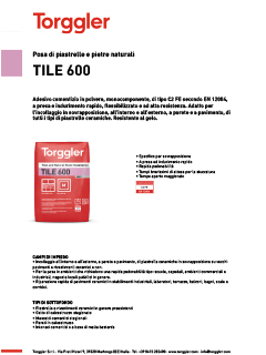 Tile 600 è un adesivo cementizio in polvere di colore grigio, a base di una miscela speciale di cementi ad alta resistenza e rapida presa e indurimento, inerti selezionati, resine sintetiche ed additivi specifici, appositamente formulato per l’incollaggio di elementi ceramici in sovrapposizione. Una volta mescolato con acqua si ottiene una colla di ottima lavorabilità , buona flessibilità ed elevata adesività su tutti i tipi di sottofondo, in particolare su vecchi pavimenti e rivestimenti ceramici o in pietra naturale. Il rapido sviluppo delle resistenze meccaniche iniziali garantisce, in condizioni normali di indurimento, la pedonabilità dopo circa 4 ore dall’incollaggio. Il tempo aperto prolungato permette la posa sicura anche in climi caldi e ventilati. È resistente ai cicli di gelo e disgelo.