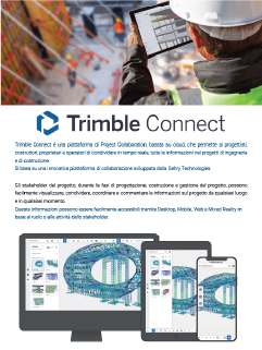 Trimble Connect รจ una piattaforma di Project Collaboration, basata su cloud, che permette a progettisti, costruttori, proprietari ed operatori di condividere in tempo reale tutte le informazioni nei progetti di ingegneria e di costruzione. Grazie alla sua flessibilitร di accesso multi dispositivo e alla scalabilitร delle sue licenze dโuso, รจ la piattaforma utilizzata da oltre 10 milioni di utenti a livello mondiale. Inoltre, grazie agli strumenti Workflow Tools, permette di fruire di tutto il contenuto informativo dei modelli BIM multidisciplinari, dallโufficio al cantiere. Trimble Connect migliora i flussi di lavoro e garantisce la consegna puntuale dei progetti, riducendo errori e ritardi.