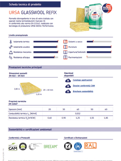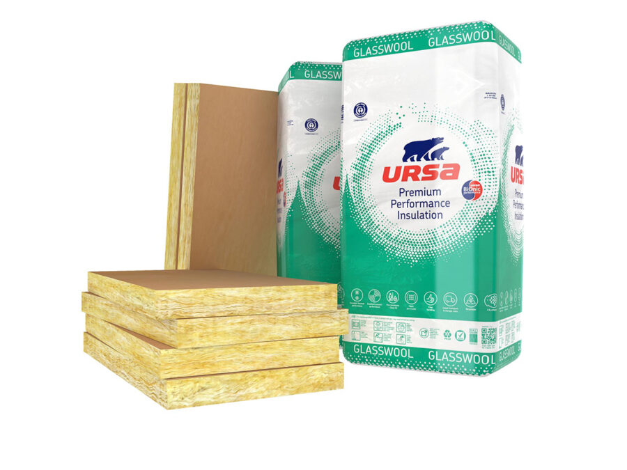Pannello idrorepellente in lana di vetro trattata con speciali resine termoindurenti marcato CE in conformità alla norma EN 13162, rivestito su una superficie con carta kraft politenata, con funzione di freno al vapore, realizzato con tecnologia di produzione URSA BiOnic Performance.