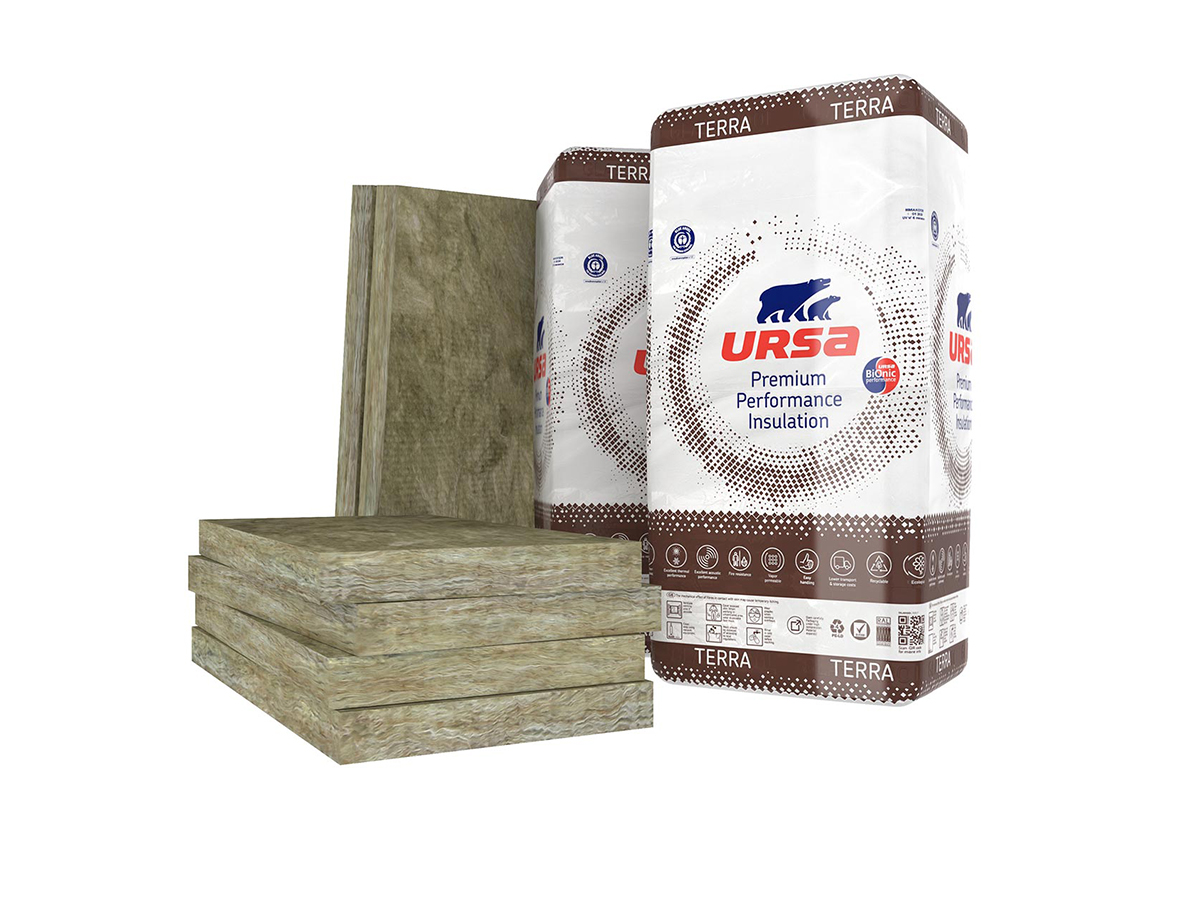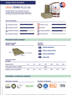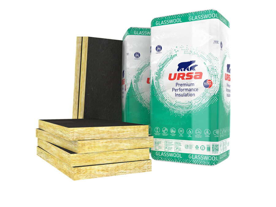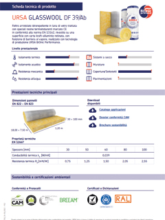 Pannello idrorepellente in lana di vetro trattata con speciali resine termoindurenti marcato CE in conformità alla norma EN 13162, realizzato con tecnologia di produzione URSA BiOnic Performance.