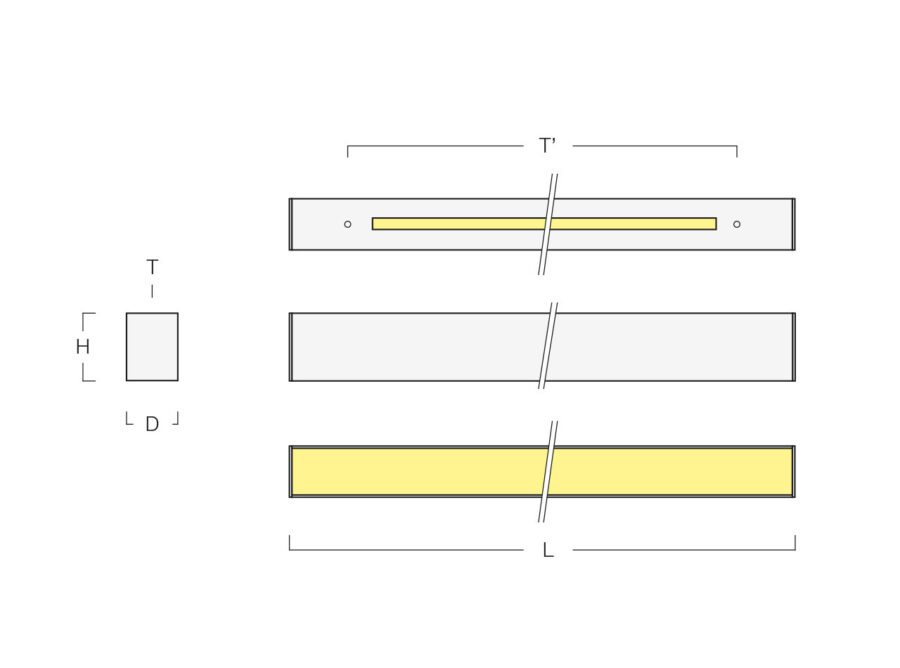 In estruso di alluminio, verniciato con polveri epossipoliestere SOLVENT FREE di colore bianco, nero, grigio o altri colori su richiesta, termoindurenti a 180°C, con pretrattamento superficiale di fosfatazione.