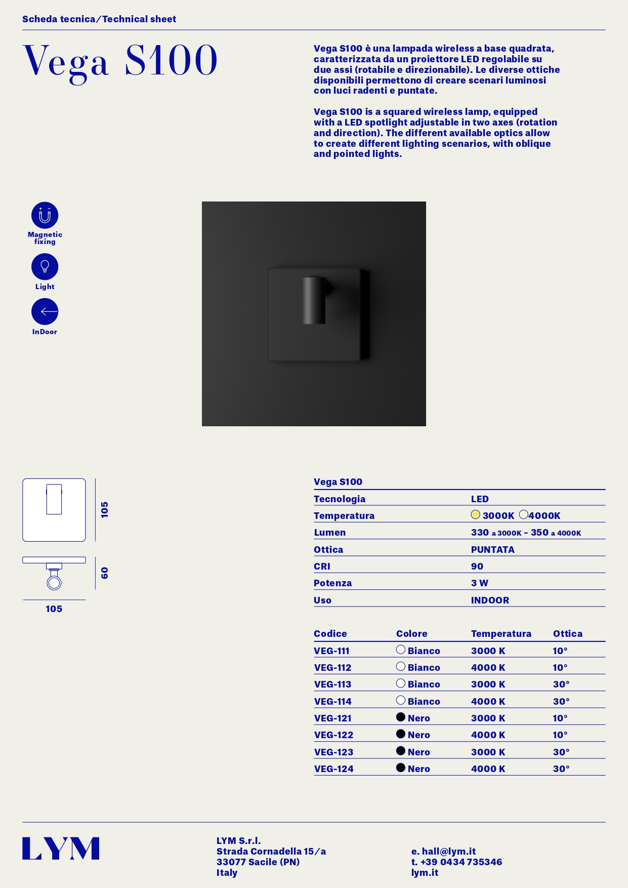 Vega100 รจ una lampada wireless caratterizzata da un proiettore LED regolabile su due assi (rotabile e direzionabile), che porta la luce esattamente dove la si desidera, creando zone di lettura, di lavoro o semplicemente illuminando e dando risalto a punti od oggetti specifici. Le diverse ottiche disponibili permettono creare scenari luminosi con luci radenti o puntate. ร disponibile nella versione quadrata o circolare.