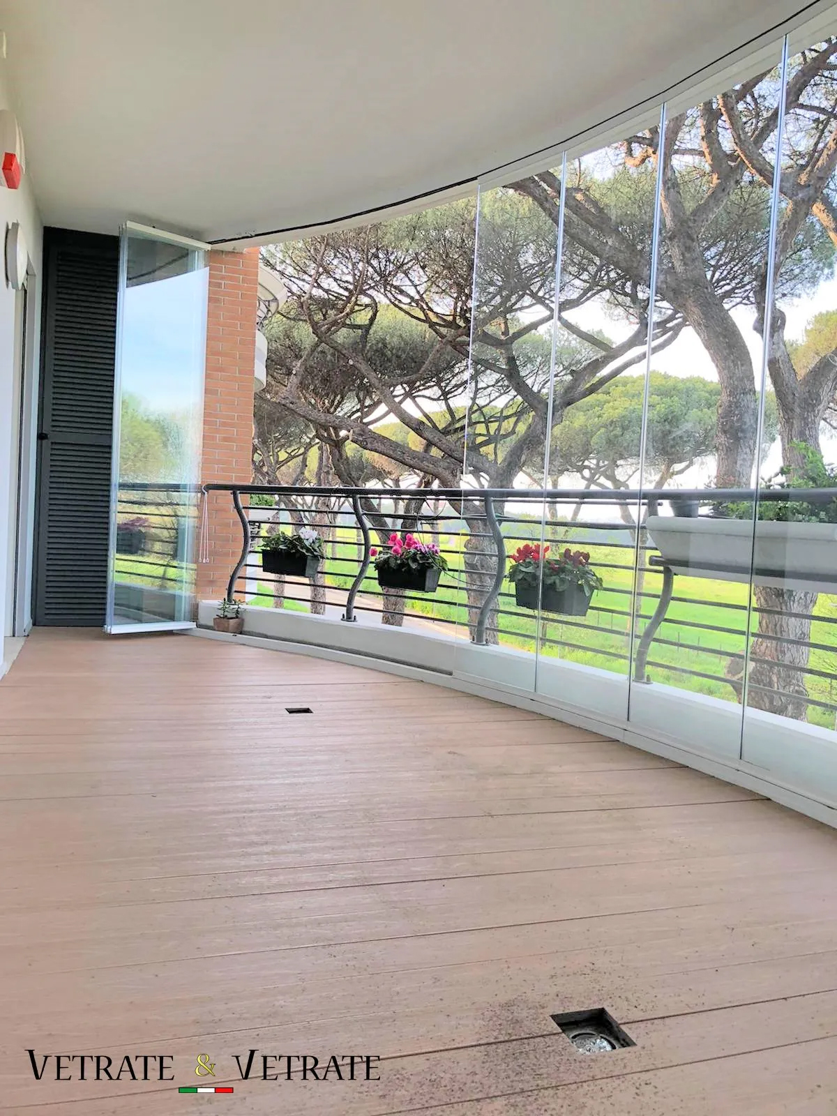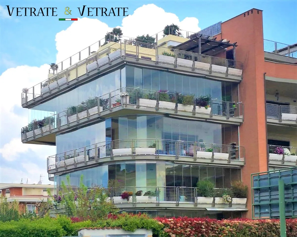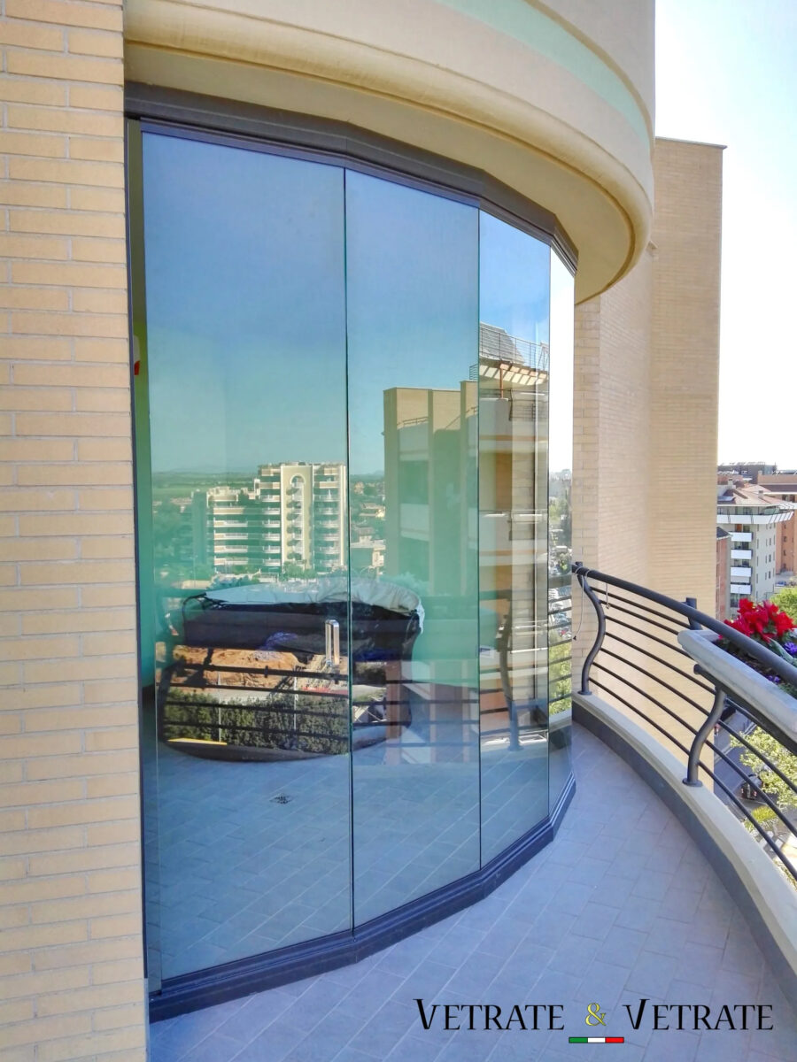 Il senso di continuità può essere esteso anche in caso di vetrate curve o con angoli a giorno a 90°, particolari tagli inclinati operati tramite macchine CNC consentono di seguire l’andamento della curva d’interesse senza tappi di giunzione e mantenendo il profilo vivo sulla vetrata scorrevole che sarà in questo caso sfaccettata. L’angolo a giorno inoltre viene creato con la stessa modalità di taglio dei profili adottato nelle vetrate curve, oltre ad una speciale guarnizione ad angolo e una lavorazione dei vetri di battuta.