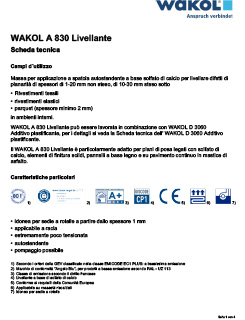 Livellante a base solfato di calcio per livellare difetti di planarità in spessori di 1 a 20 mm (senza sabbia al quarzo), con sabbia al quarzo di 10 a 30 mm steso in ambienti interni. Idoneo per pavimenti tessili e resilienti. Adatto sotto parquet da spessore di 2 mm. Può essere lavorata in combinazione con WAKOL D 3060 Additivo plastificante. Particolarmente idoneo su piani di posa legati con solfato di calcio, elementi di finitura solidi, pannelli in legno e pavimenti in mastice d’asfalto. Idoneo per uso con rasiera. Pompaggio possibile.
