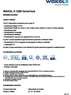 Colla in dispersione per la posa di linoleum, pavimenti in caucciù con spessore fino a 2,5 mm, pavimentazioni tessili con supporto in tessuto non tessuto, in schiuma di lattice, sintetico pluristrato, in juta, pavimentazione tessile moquettes ed in feltro, come anche per pavimenti in PVC e vinilici su piani di posa assorbenti e non assorbenti. WAKOL D 3360 è conforme alla DIN EN 14259.