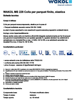 Colla per parquet monocomponente, elastica per la posa di elementi multistrato ad incastro su fondi assorbenti e non assorbenti in ambienti interni. WAKOL MS 228 è conforme alla DIN EN ISO 17178.
