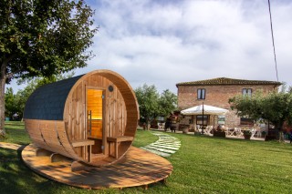 La sauna a botte da esterno con vetrata panoramica nella misura da 240 cm è dotata anche di un balconcino esterno.