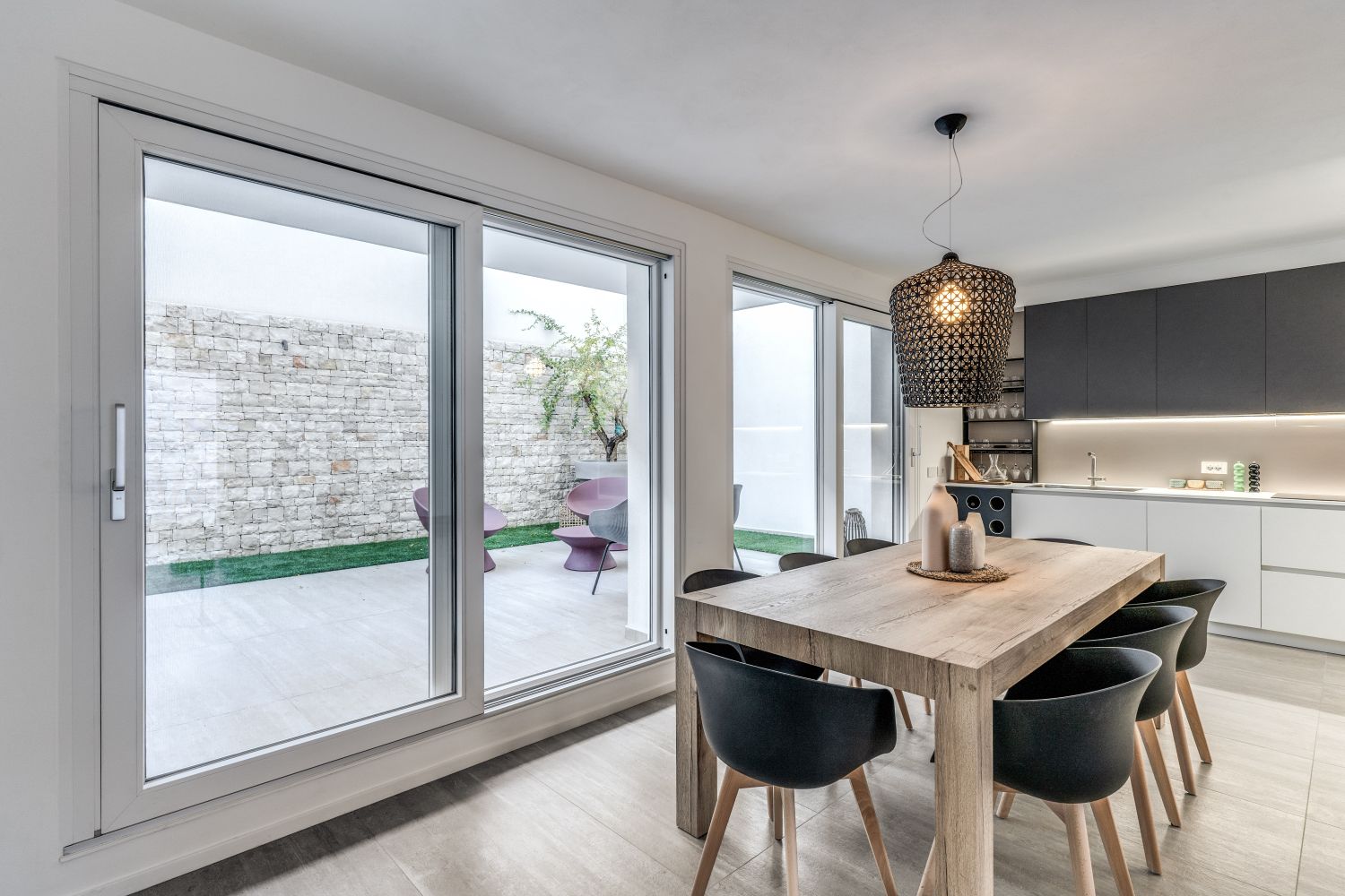 Il risultato è una casa che vive di luce. Le ampie vetrate scorrevoli HST Motion, abbinate alle finestre e portefinestre Prolux Evolution, disegnano spazi aperti e ariosi, creando una perfetta continuità tra interno ed esterno. Il sistema scorrevole di Oknoplast unisce estetica e funzionalità: grazie alla soglia ribassata e al meccanismo di scorrimento fluido, garantisce movimenti leggeri e silenziosi anche con vetrate di grandi dimensioni. L’elevata tenuta termica e acustica si combina con un design minimale, profili sottili e ampie superfici vetrate che amplificano la luminosità e il comfort abitativo.